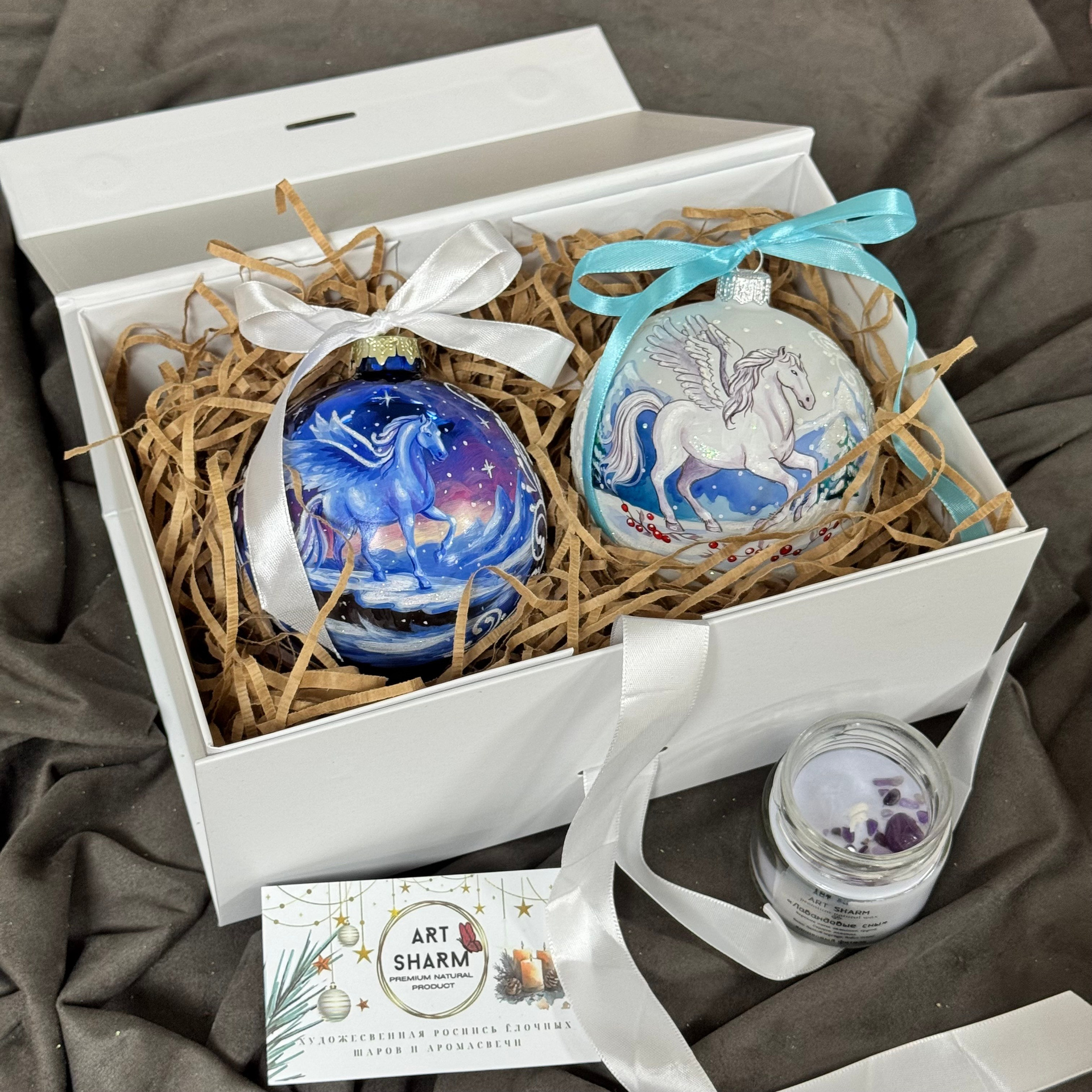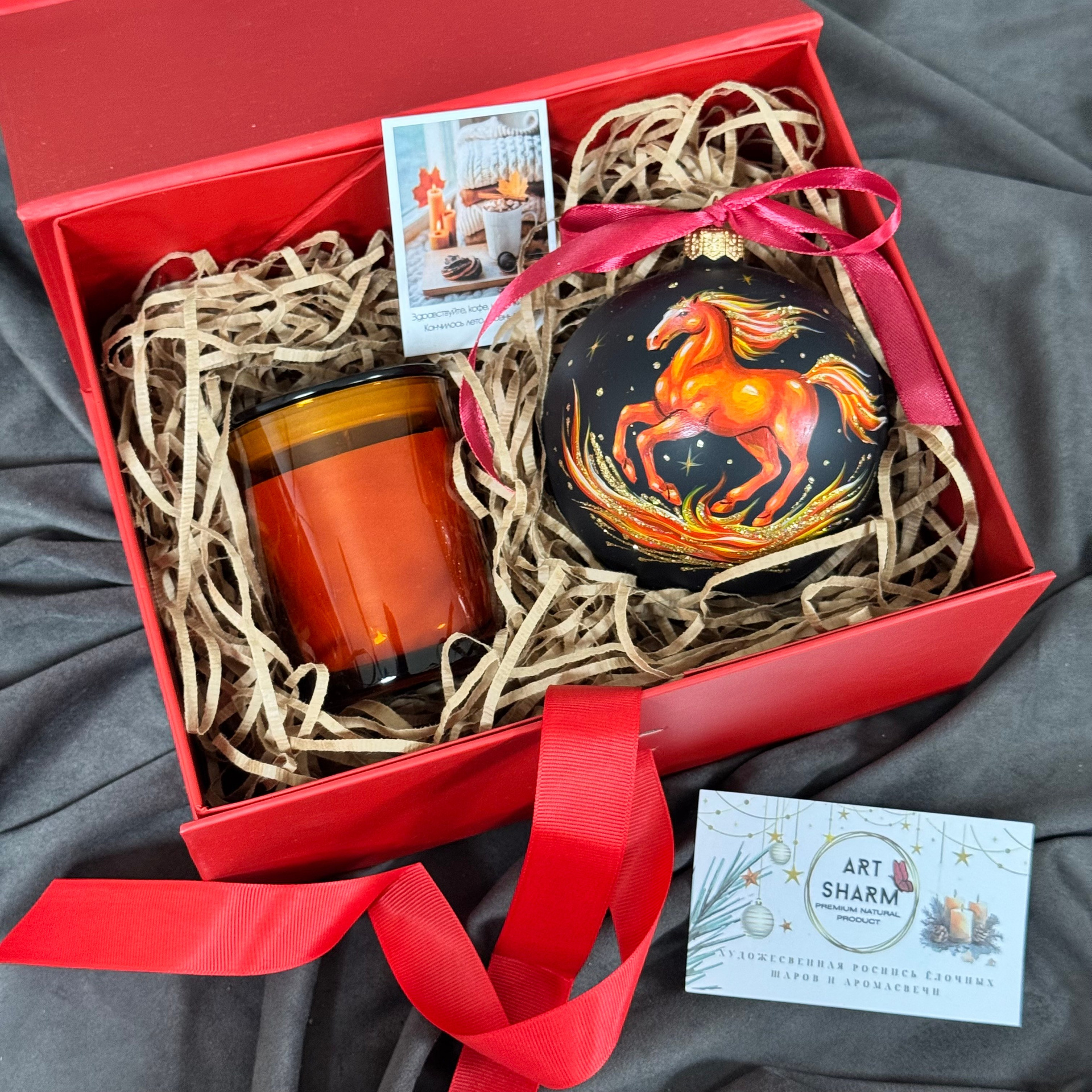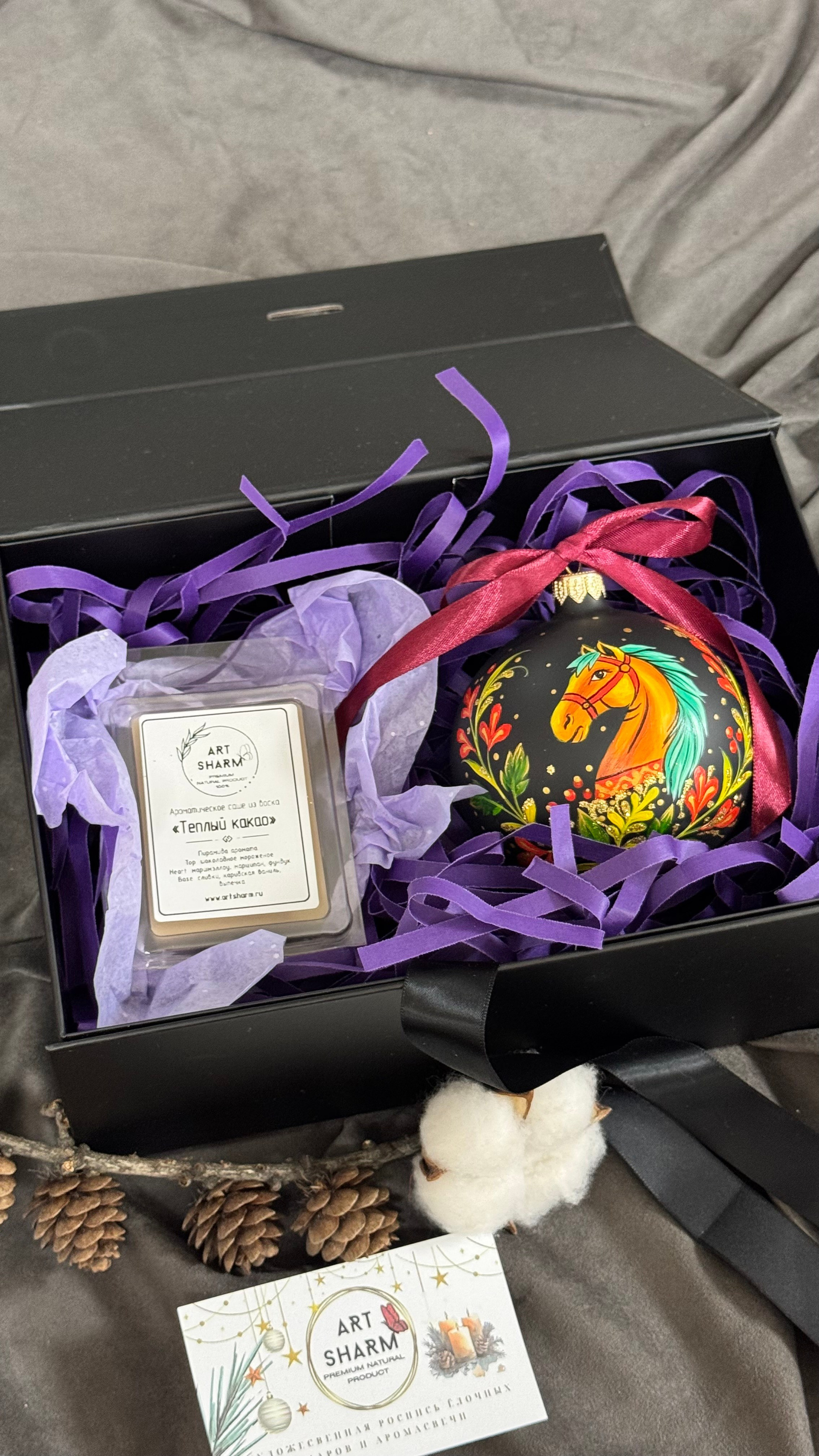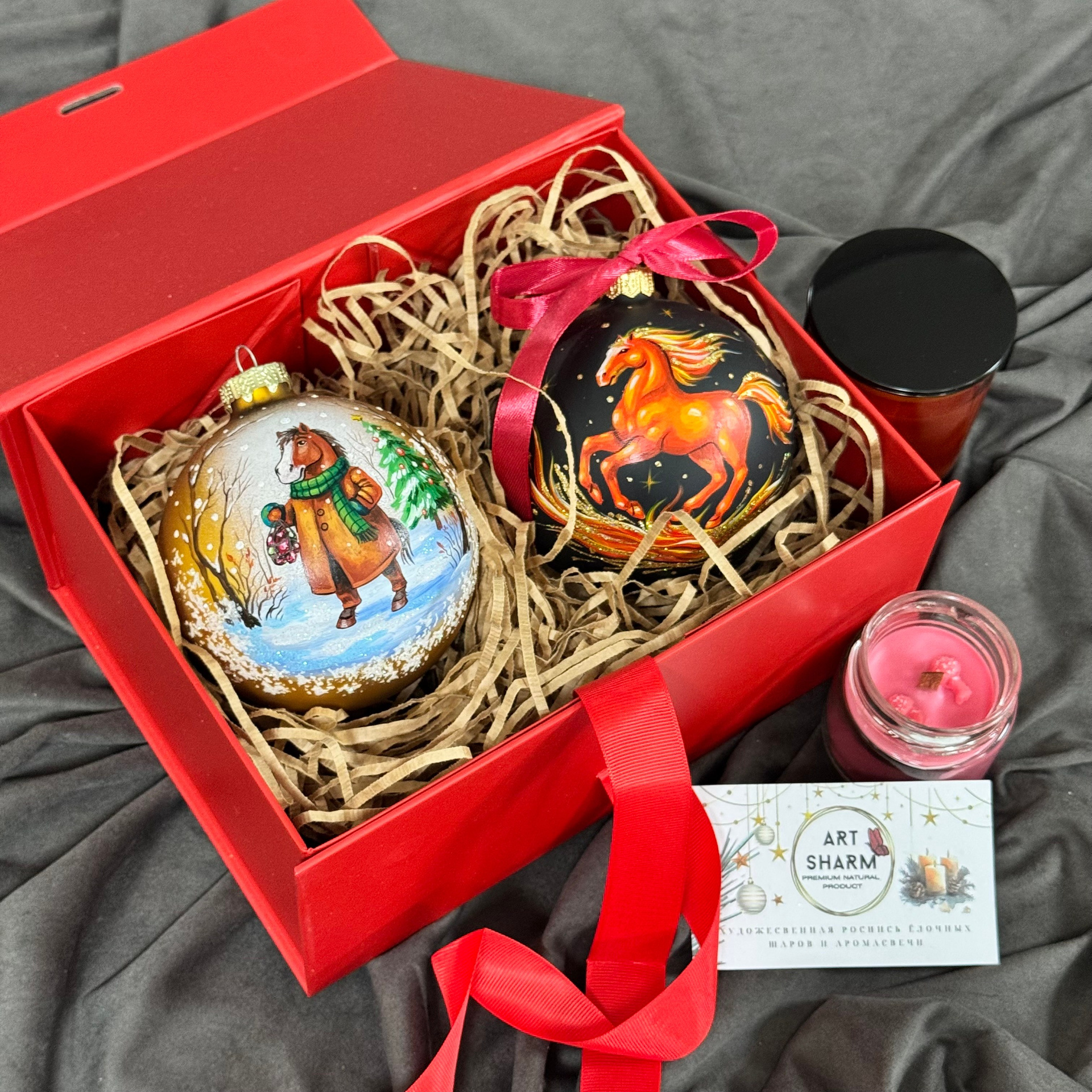 Состав набора: стеклянный шар с ручной художественной росписью 100 мм — « Огненная лошадка», свеча авторская (аромат на выбор), ароматный воск с открыткой, подарочная коробка с мягким наполнением.