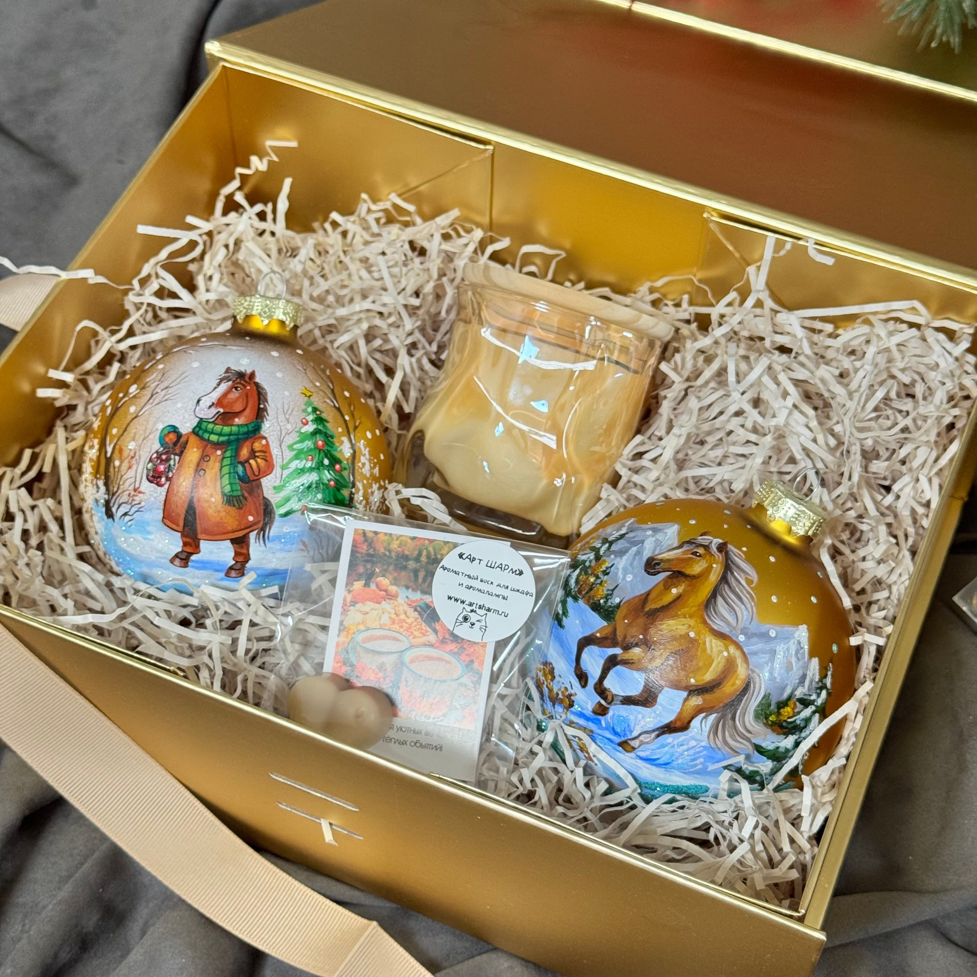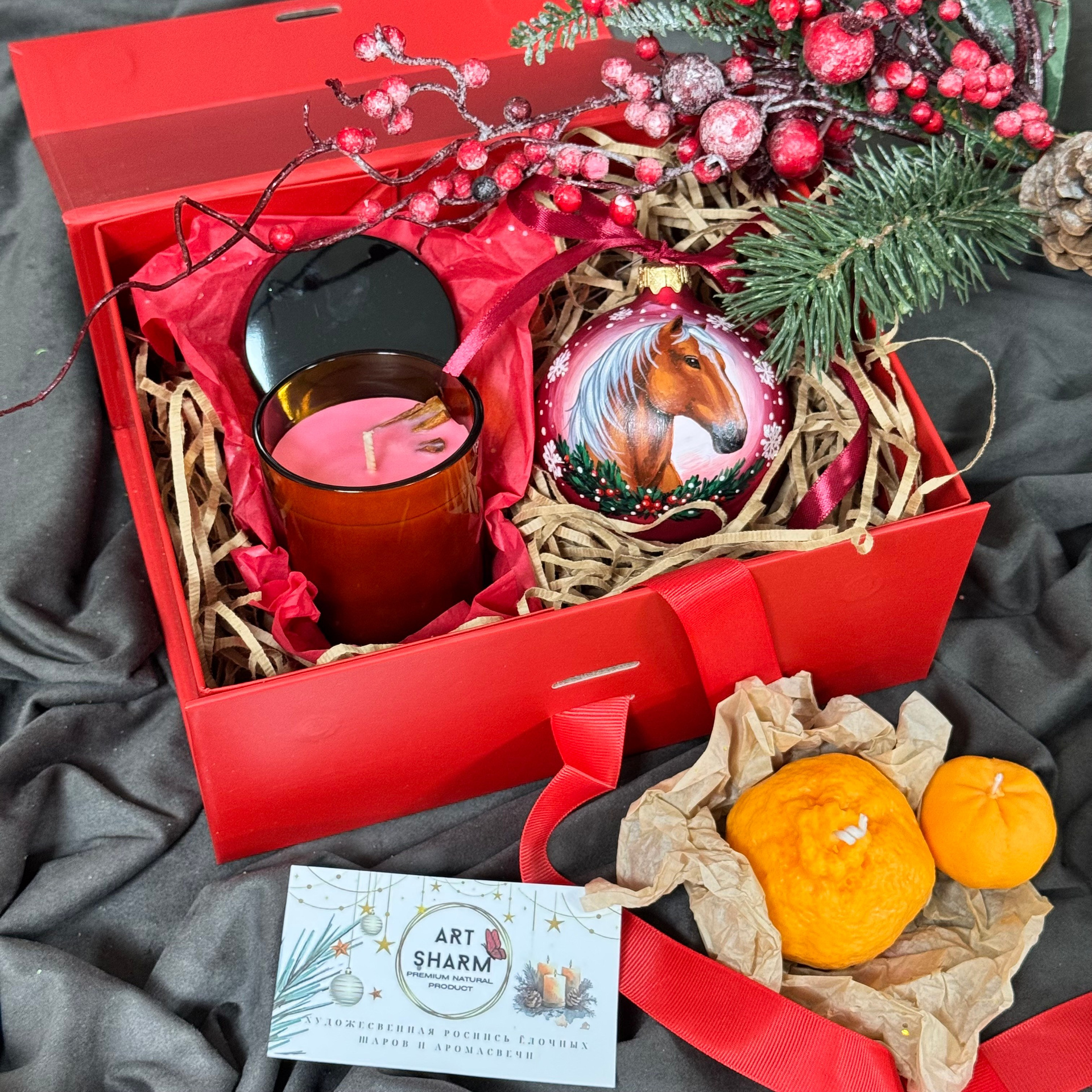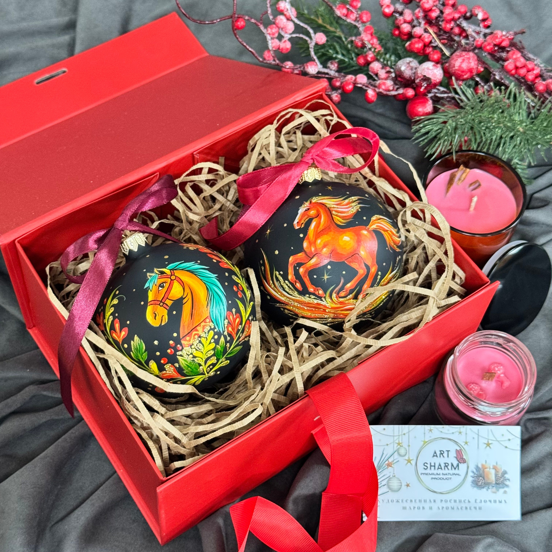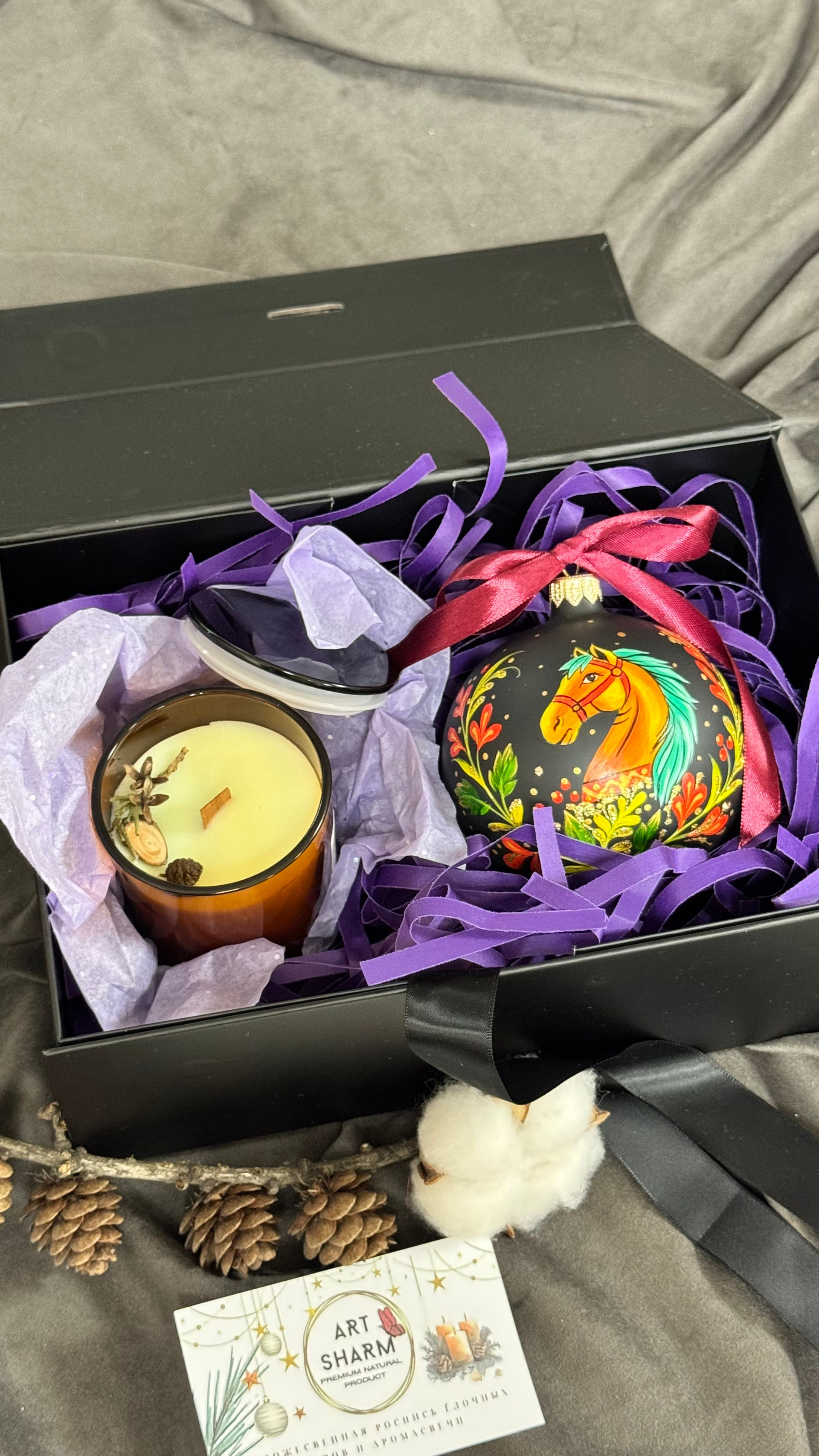 Состав набора: стеклянный шар с ручной художественной росписью 100 мм — « Огненная лошадка», свеча авторская (аромат на выбор), ароматный воск с открыткой, подарочная коробка с мягким наполнением.