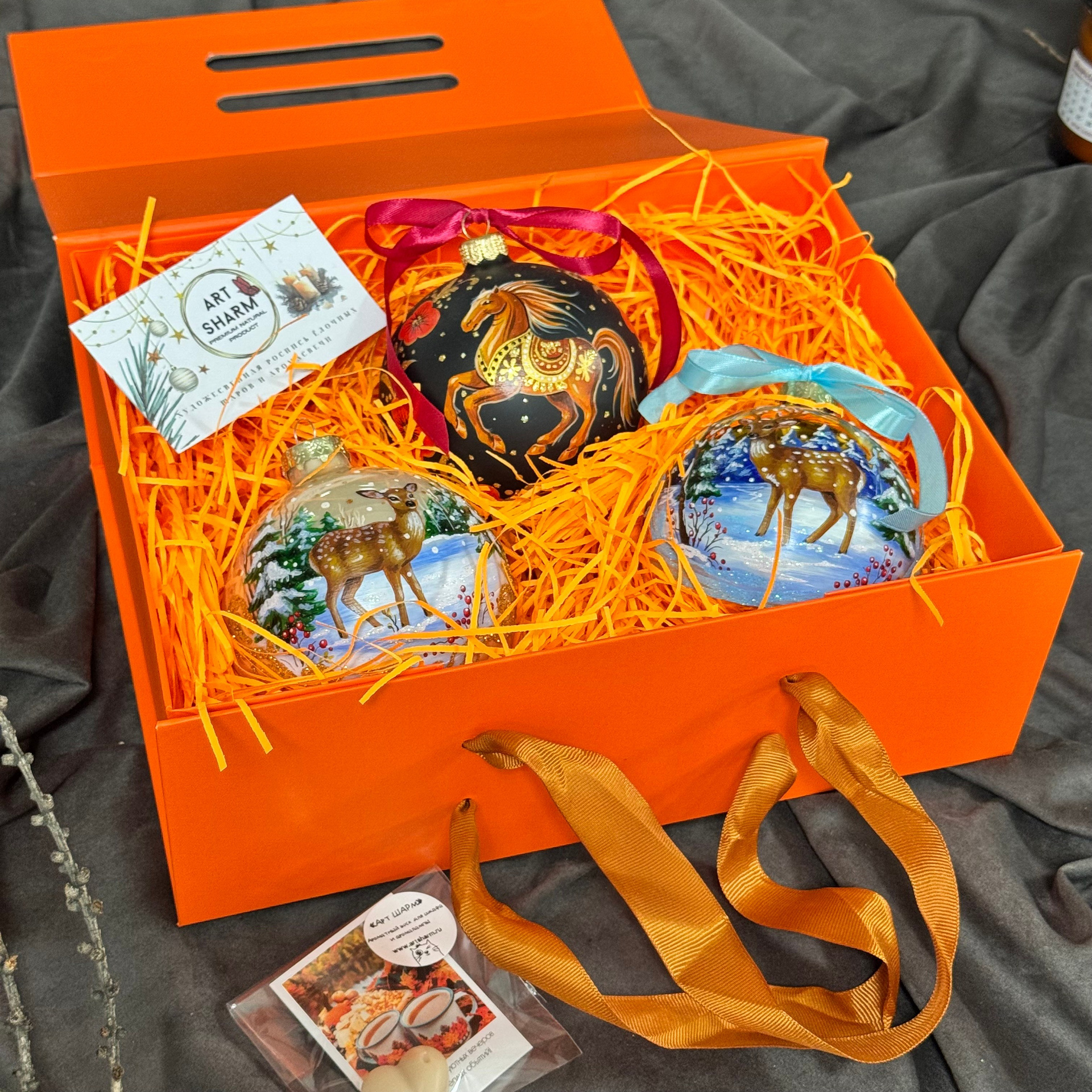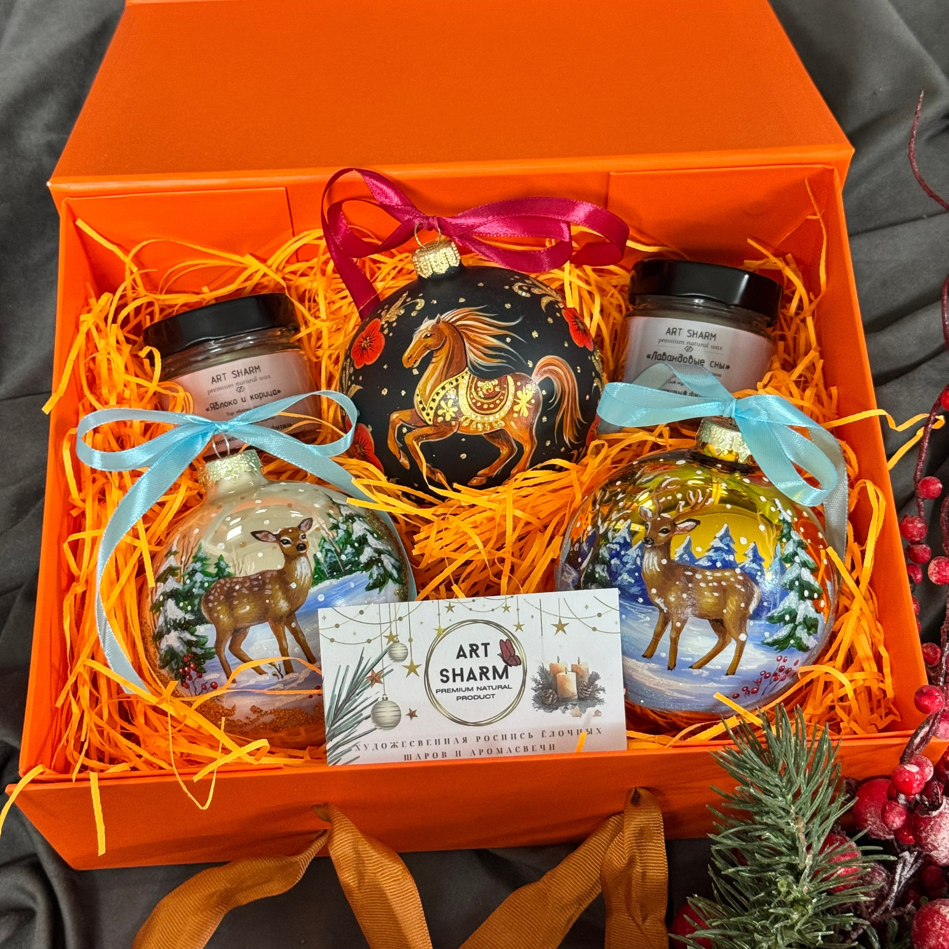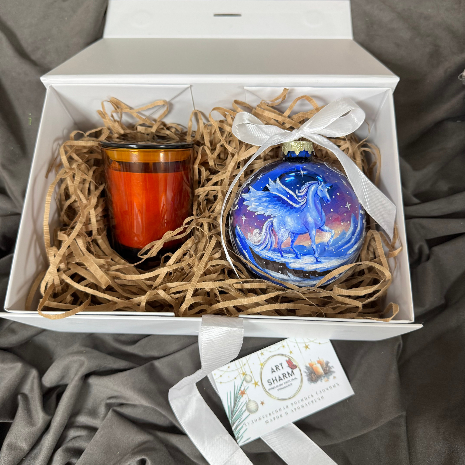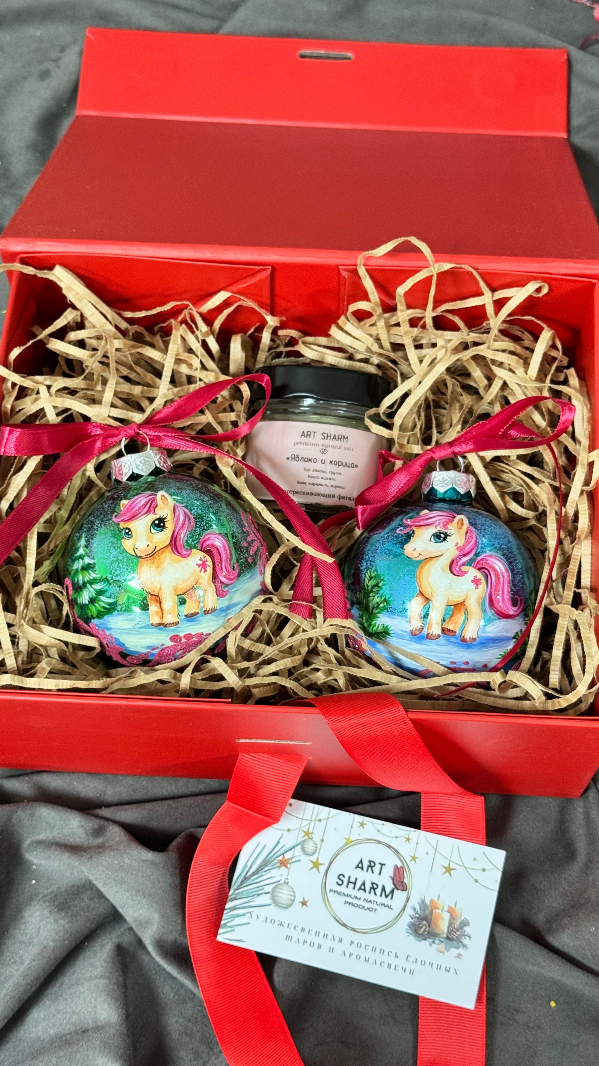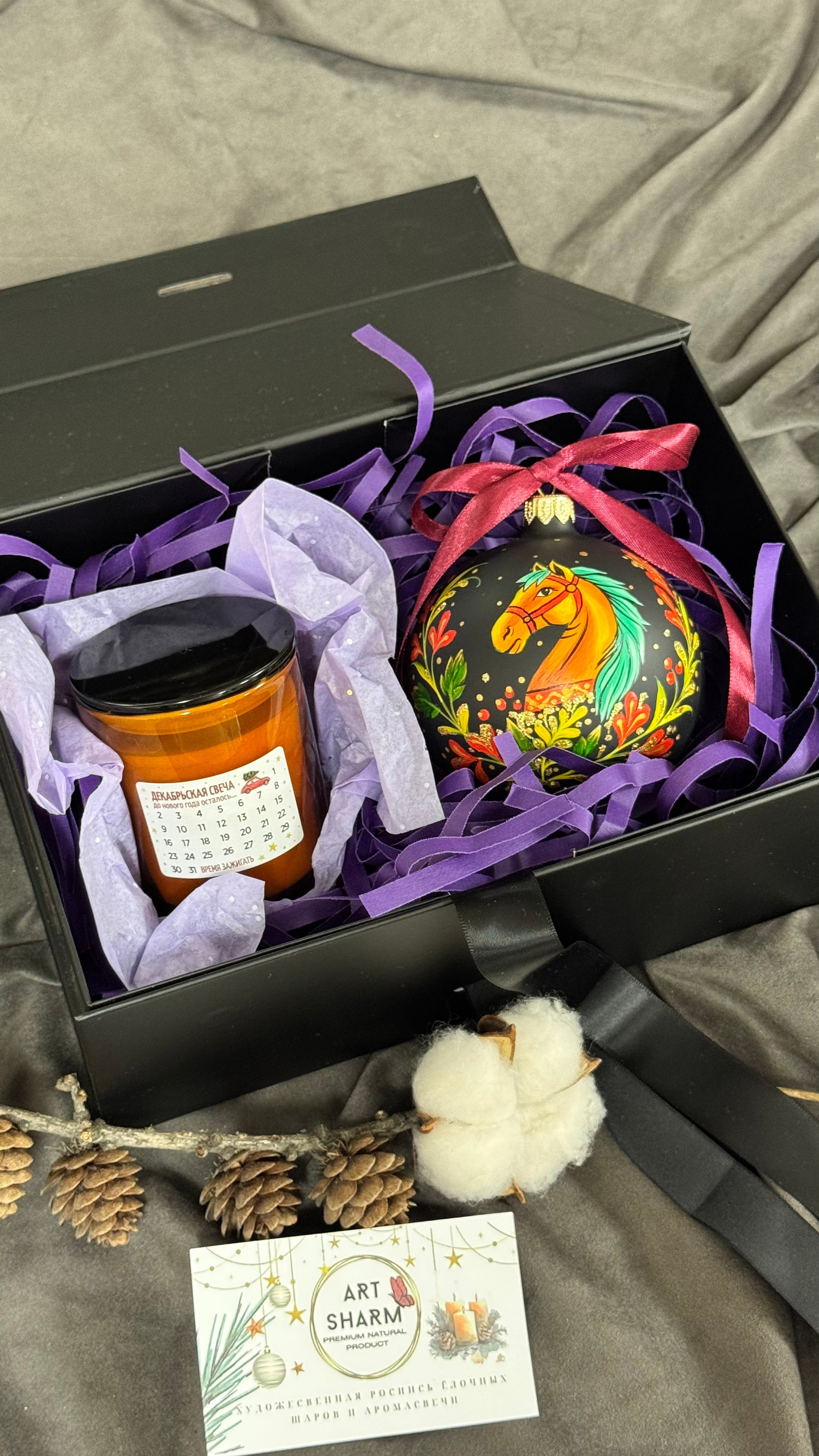 Состав набора: стеклянный шар с ручной художественной росписью 100 мм — « Огненная лошадка», свеча авторская (аромат на выбор), ароматный воск с открыткой, подарочная коробка с мягким наполнением.