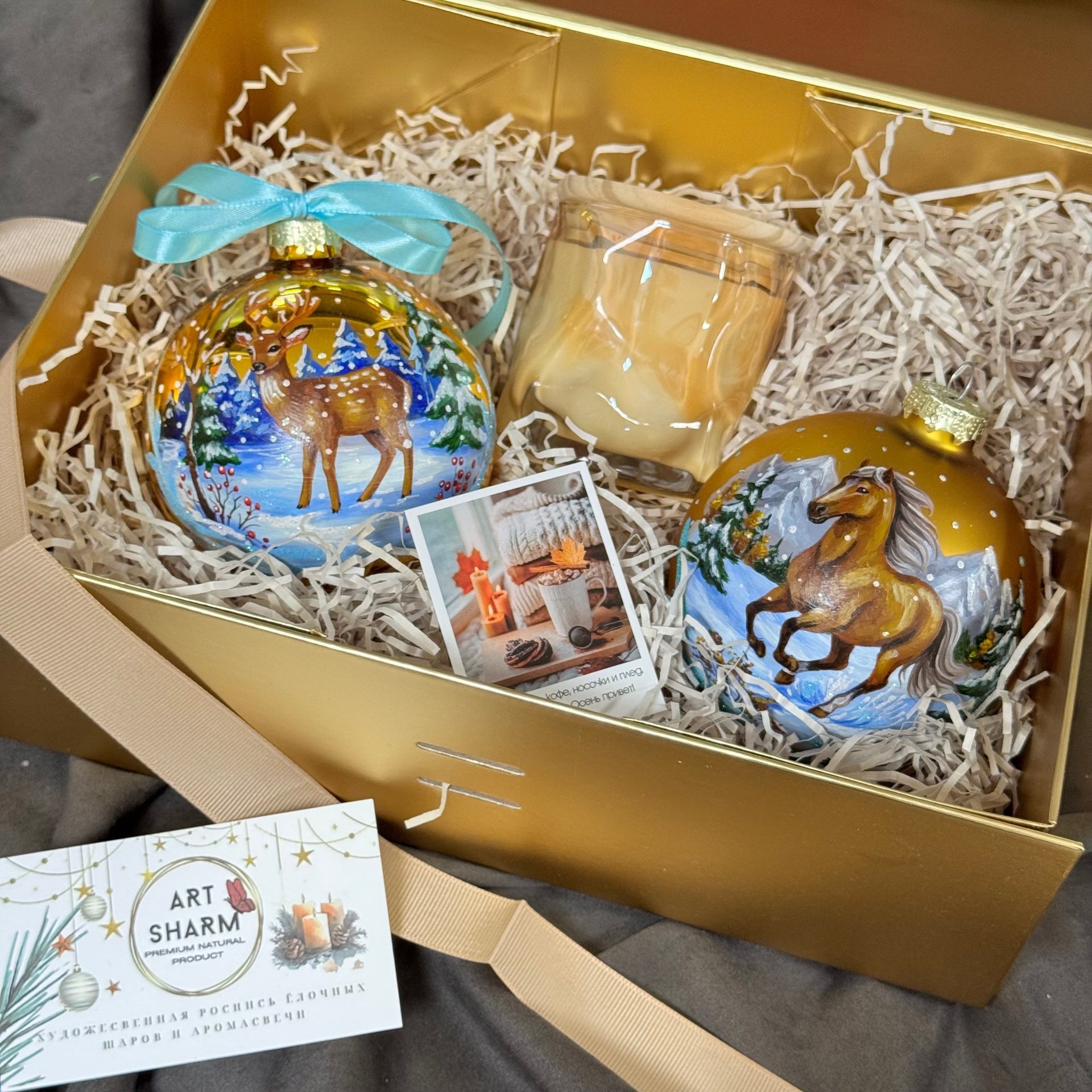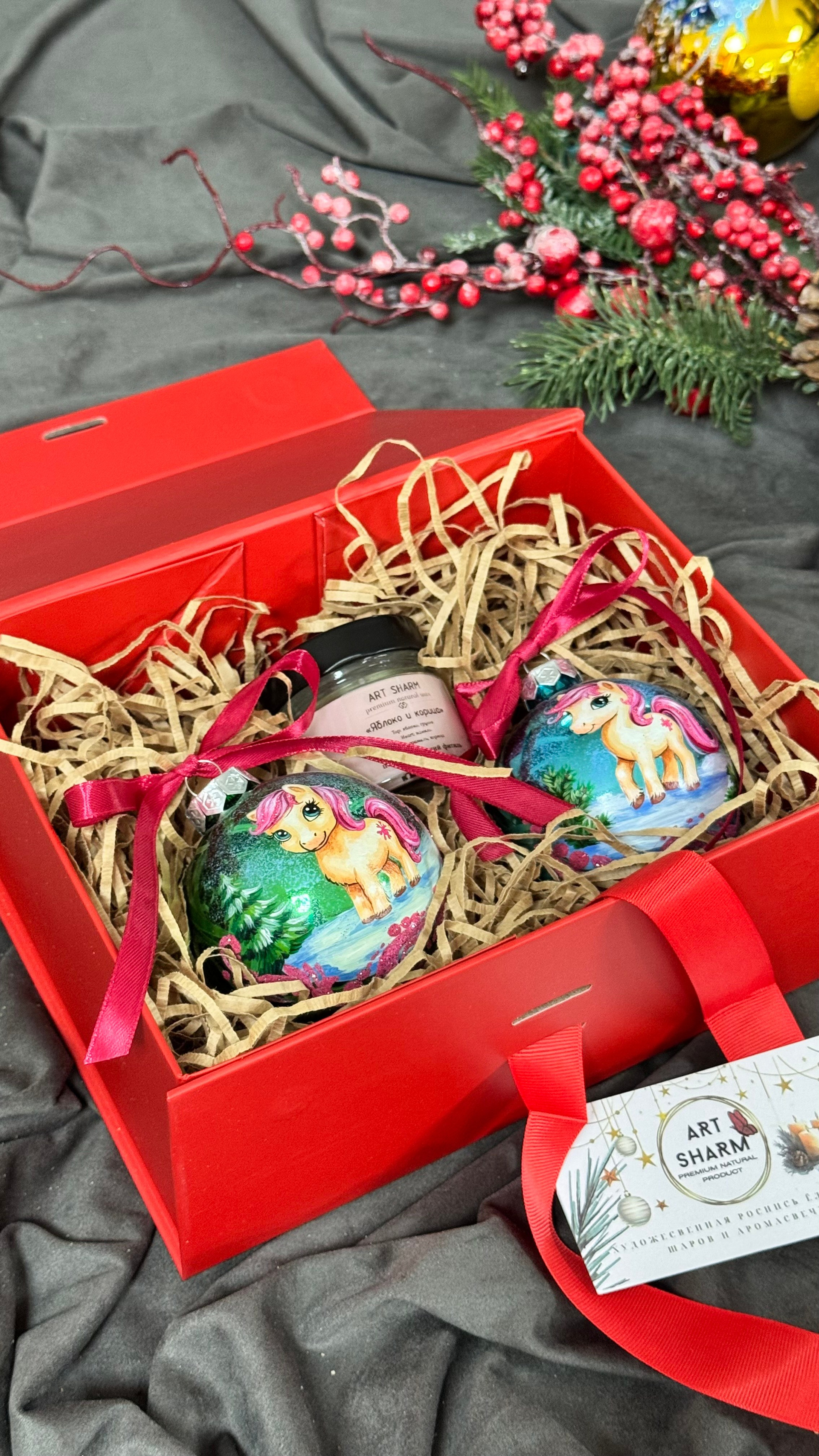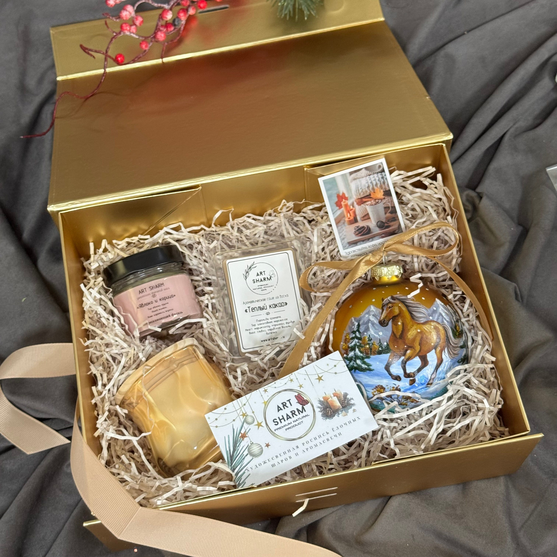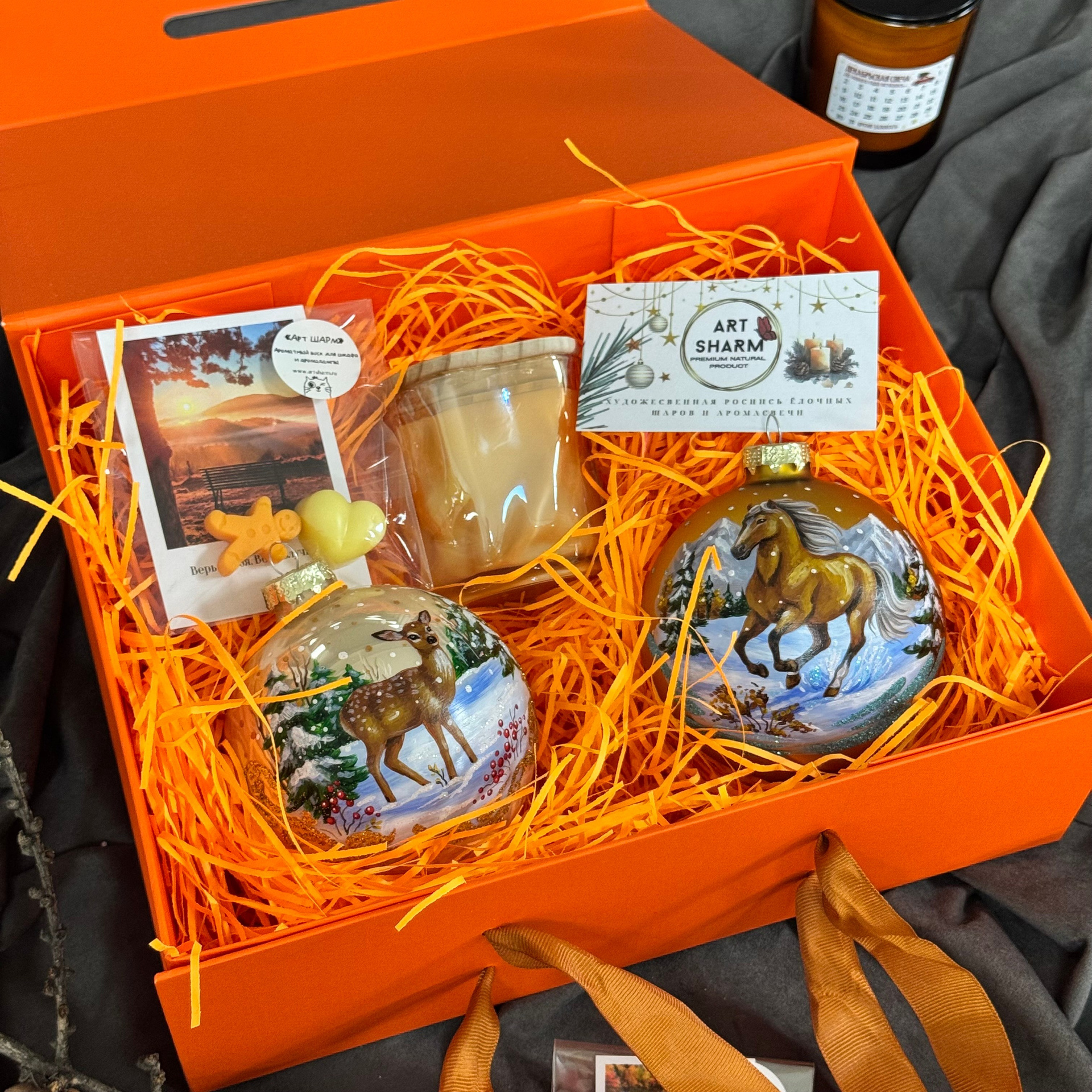 Состав набора: стеклянный шар с ручной художественной росписью 100 мм — « Огненная лошадка», свеча авторская (аромат на выбор), ароматный воск с открыткой, подарочная коробка с мягким наполнением.