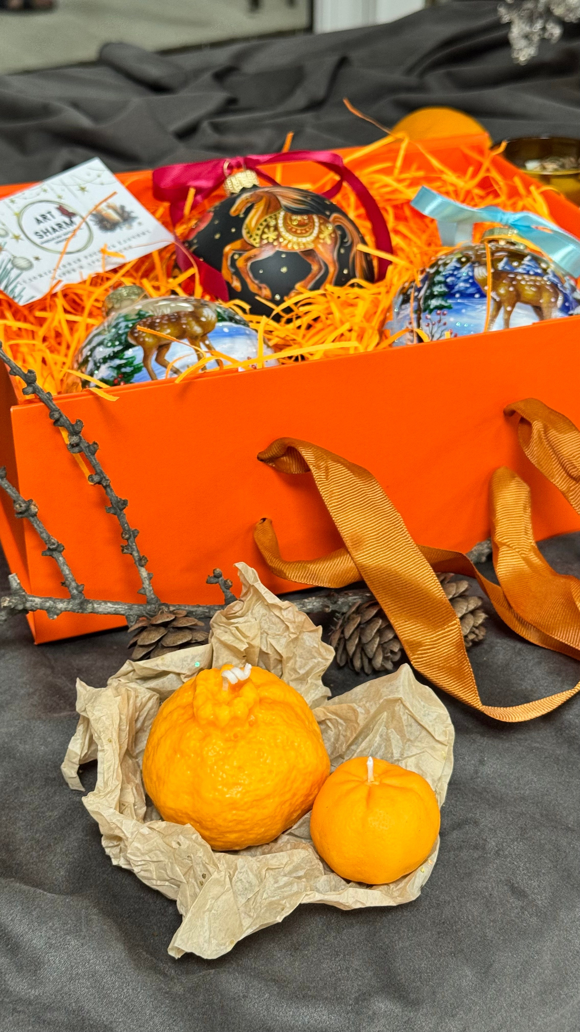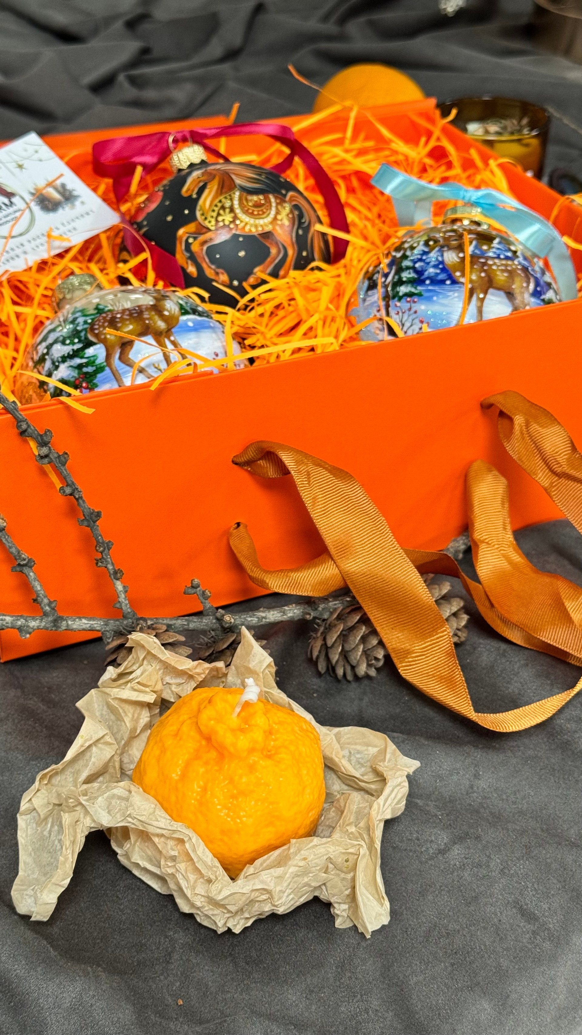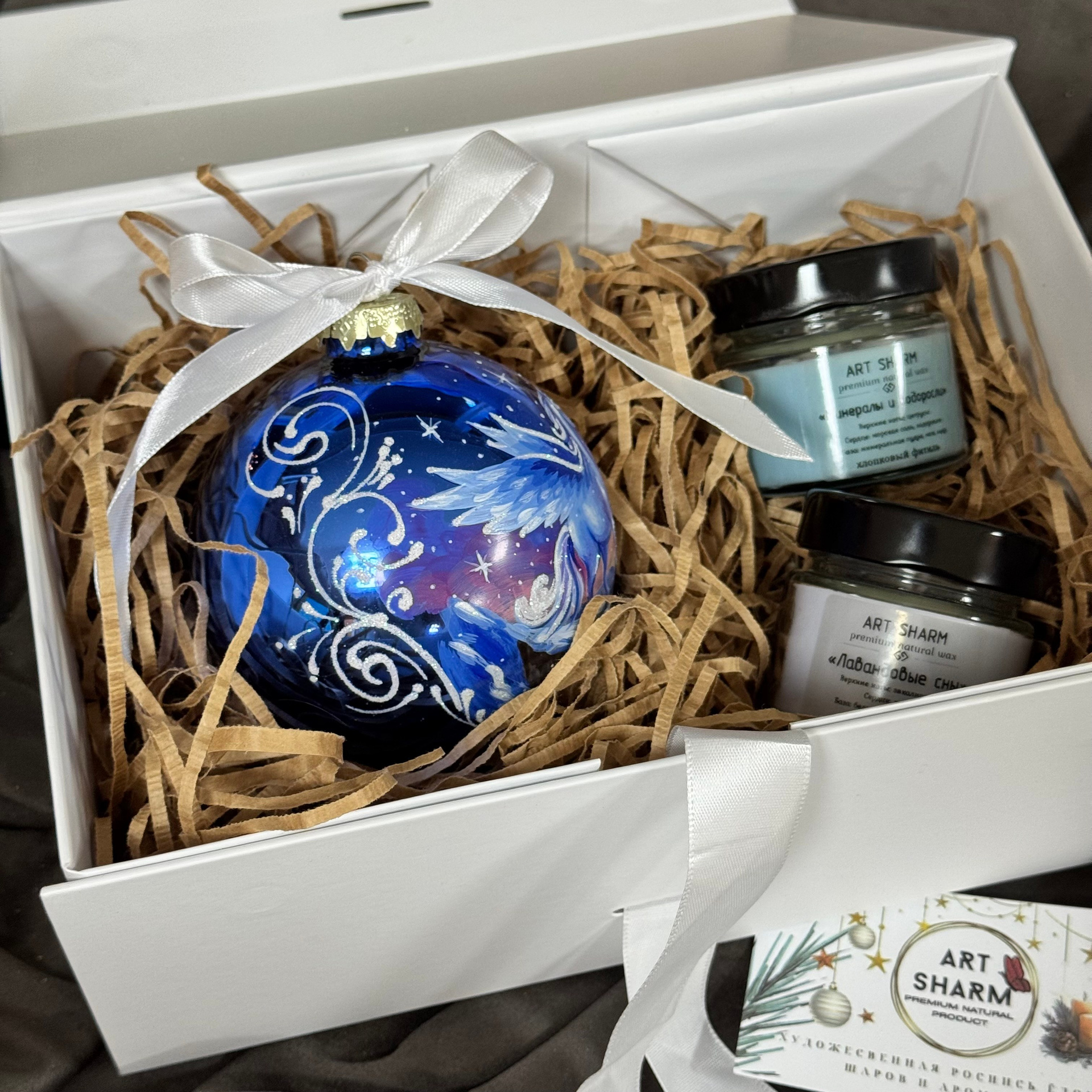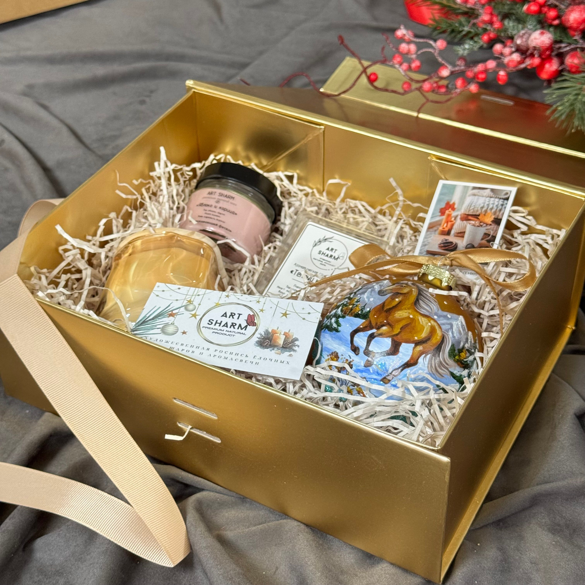 Состав набора: стеклянный шар с ручной художественной росписью 100 мм — « Огненная лошадка», свеча авторская (аромат на выбор), ароматный воск с открыткой, подарочная коробка с мягким наполнением.