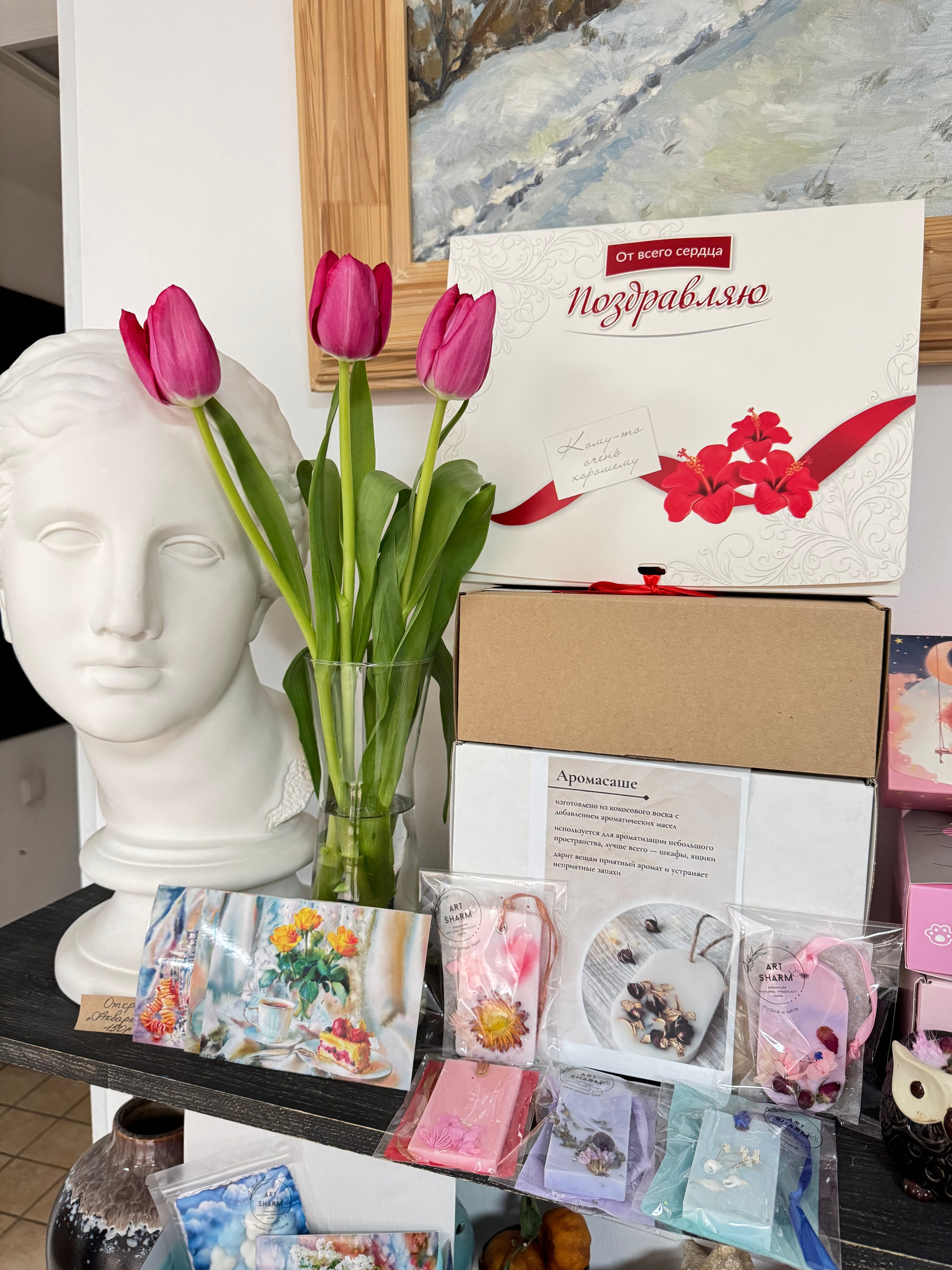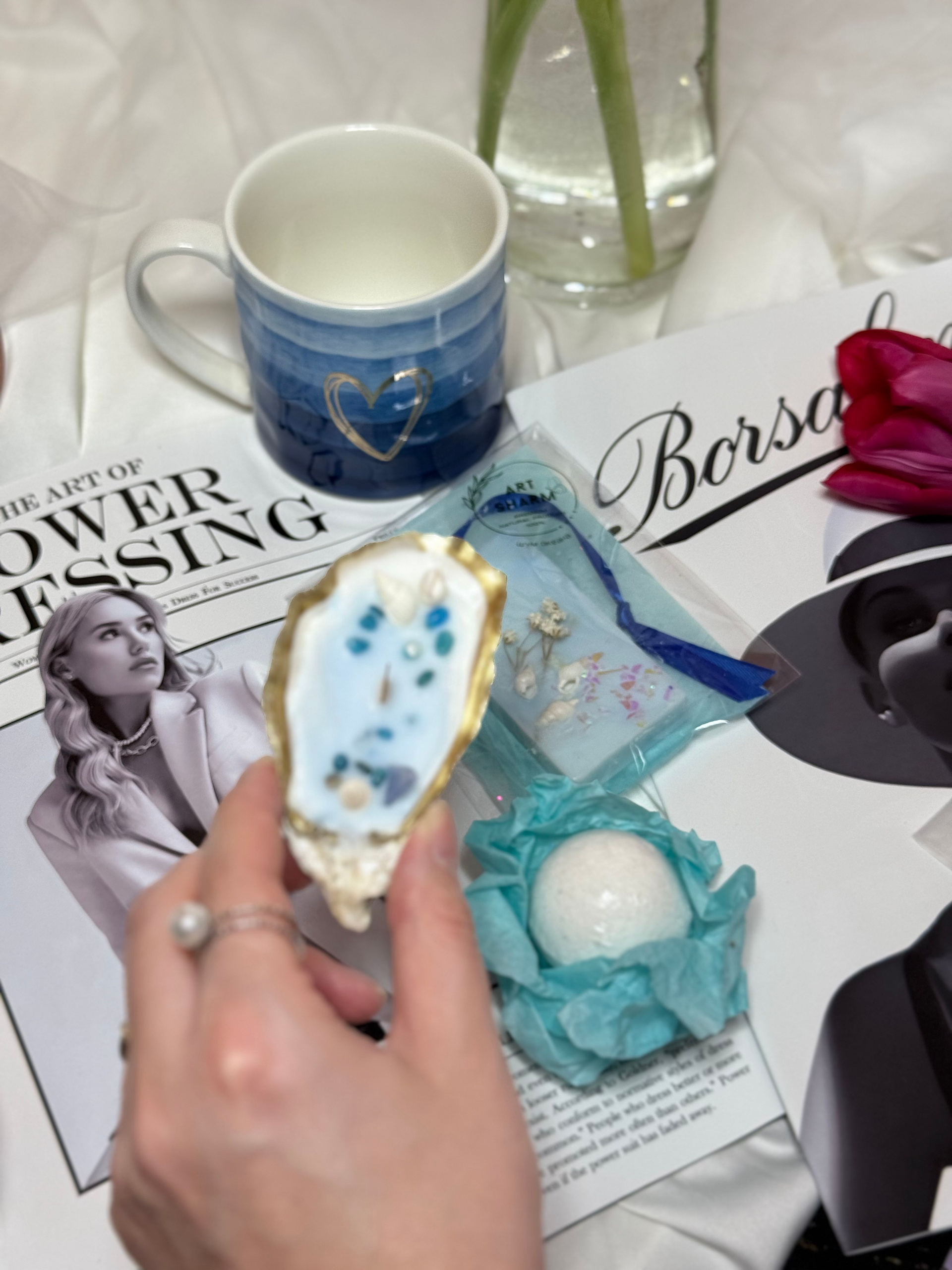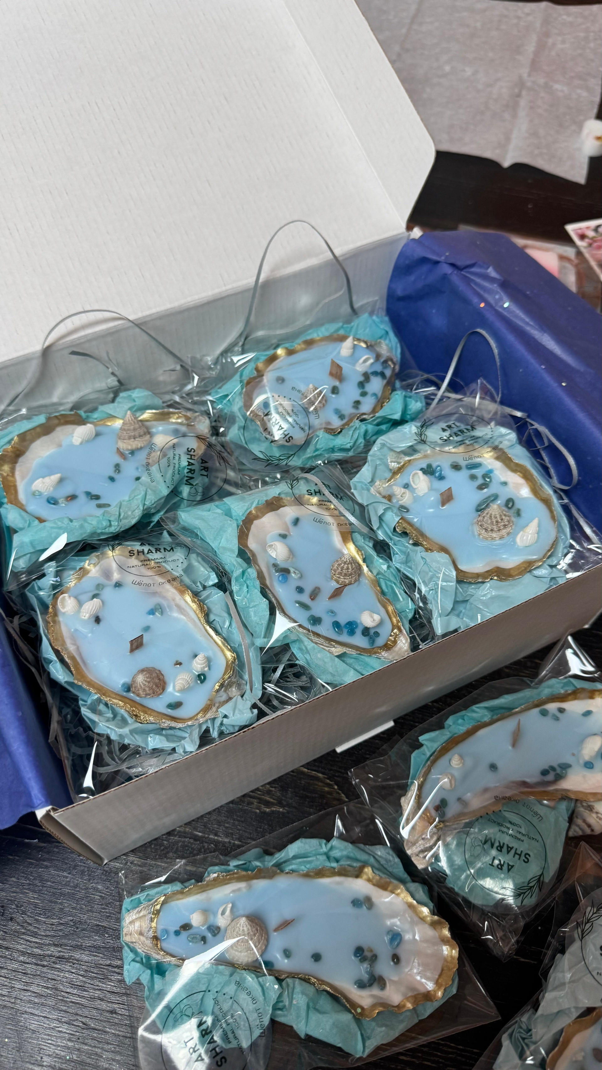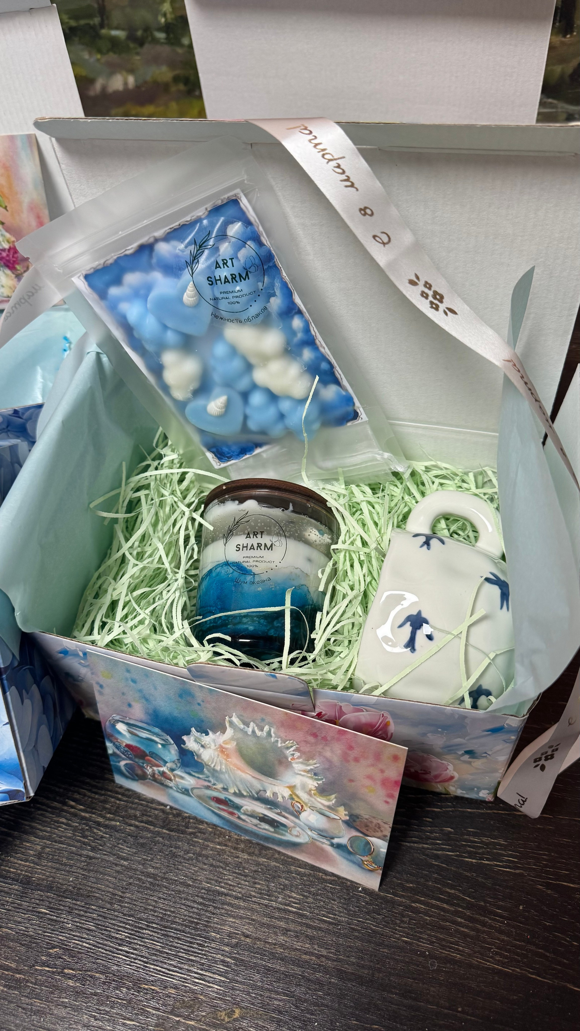 Состав набора: свеча авторская, мини-картина маслом (10×10 см) на деревянном мольберте, свеча в устрице, бурлящий шар для ванн, флорентийское Саше, подарочная коробка с мягким наполнением.