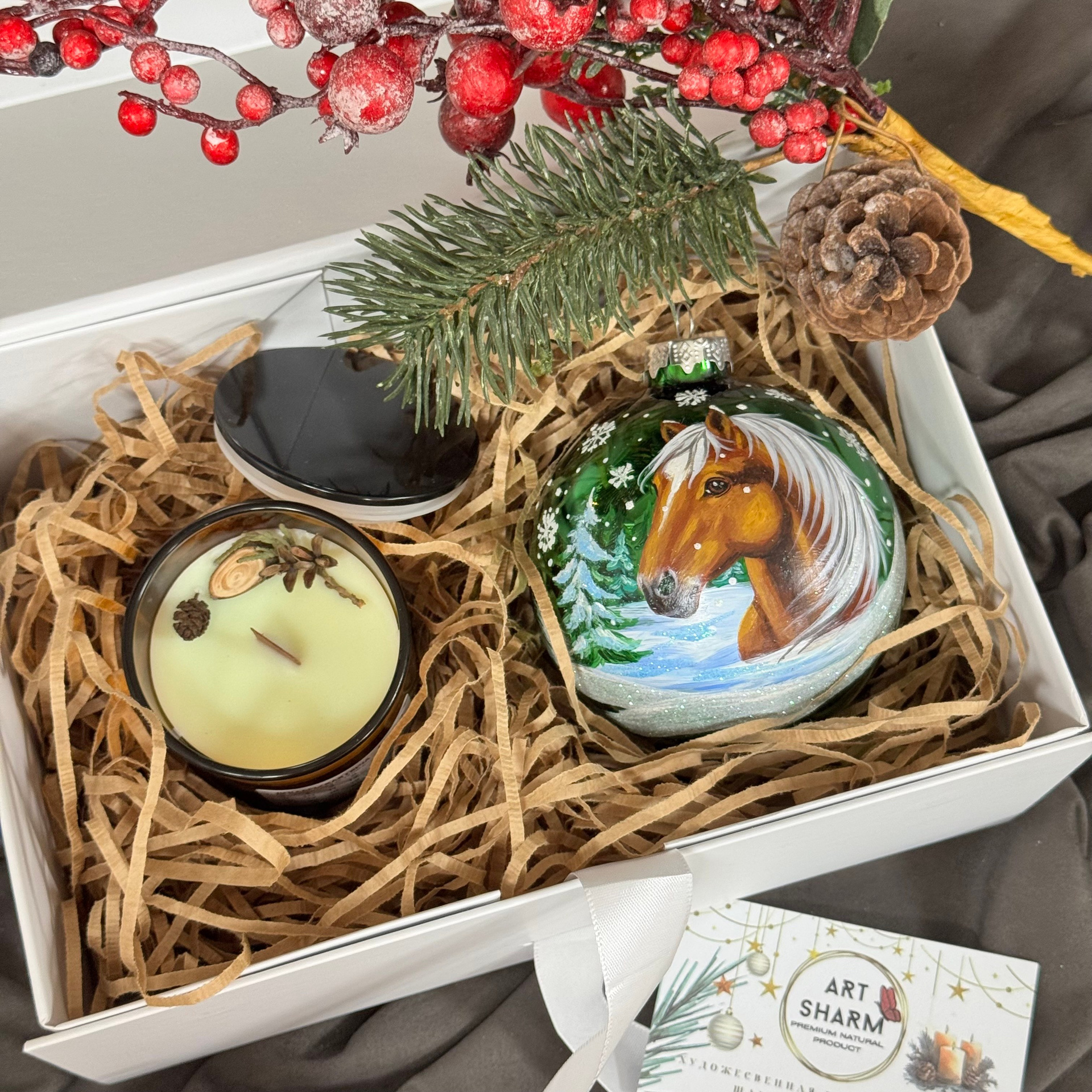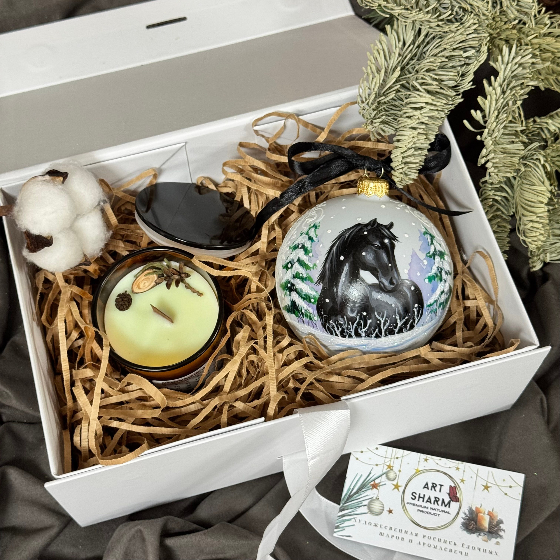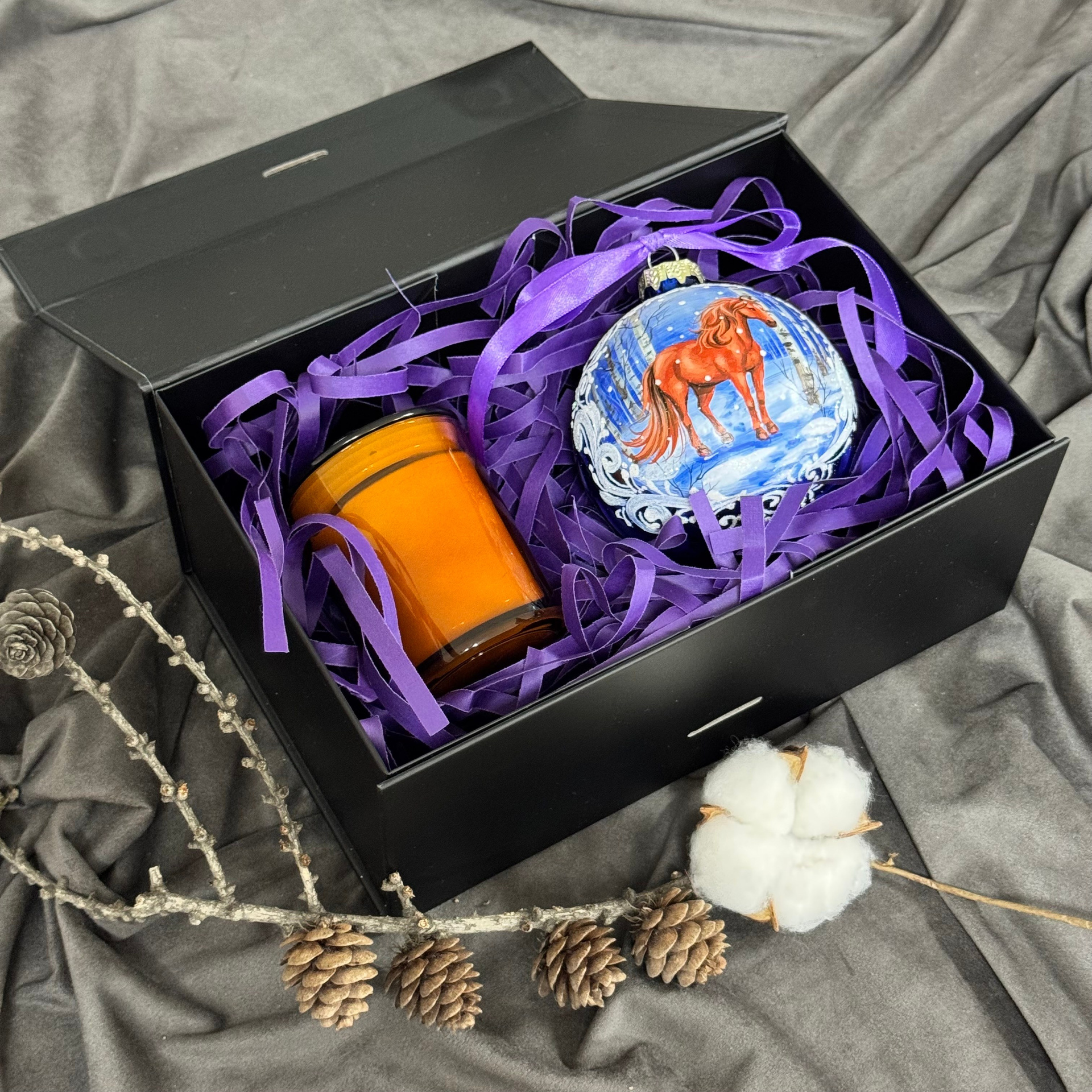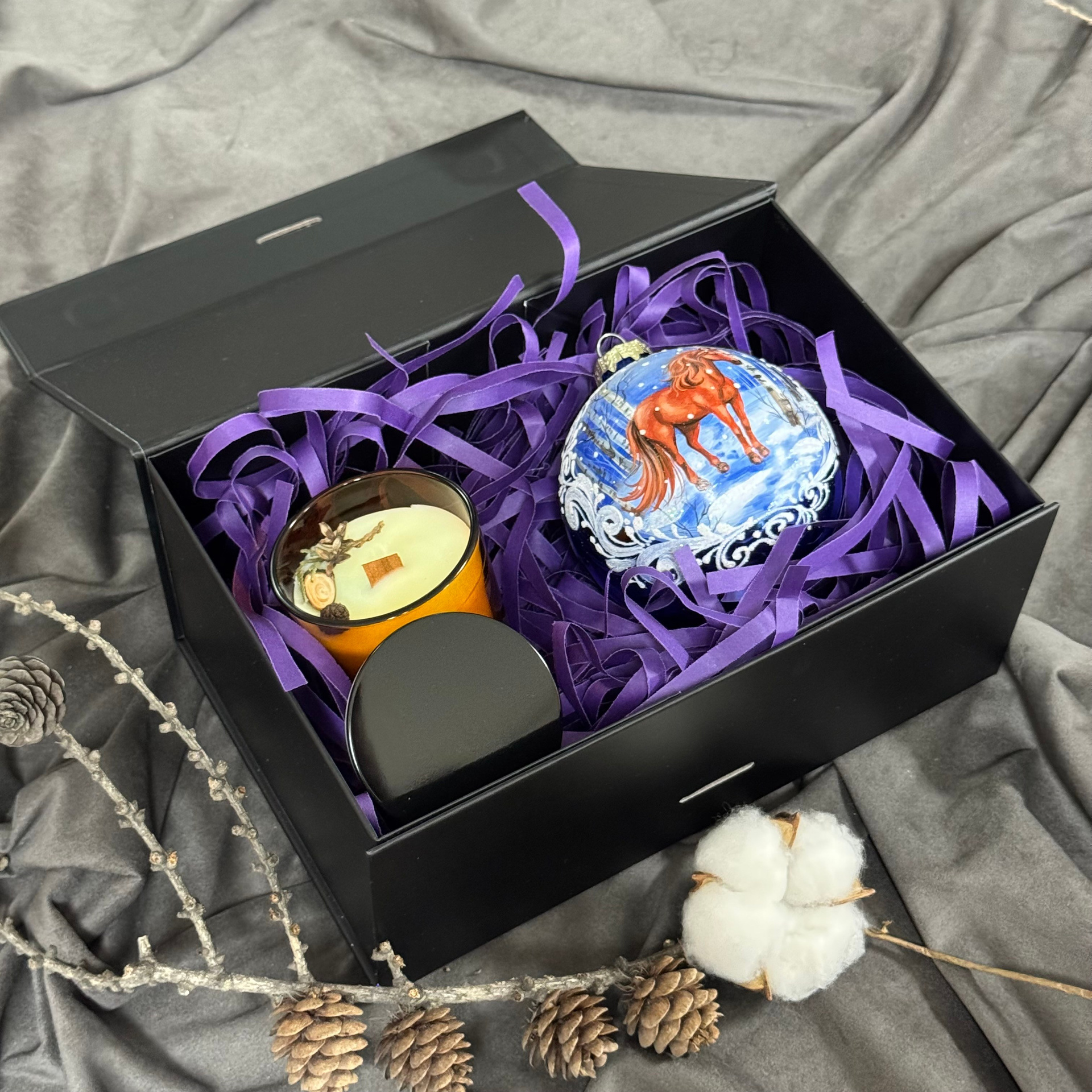 Состав набора: стеклянный шар с ручной художественной росписью 100 мм — «Конь в хвойном лесу», свеча авторская (аромат «Хвойный лес»), подарочная коробка с мягким наполнением и магнитныи клапаном с лентой.