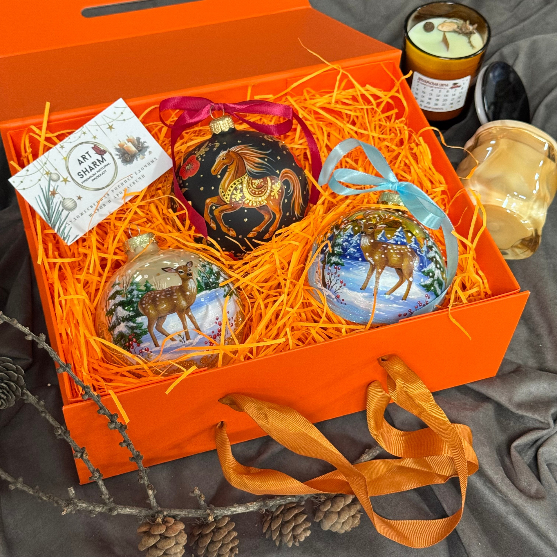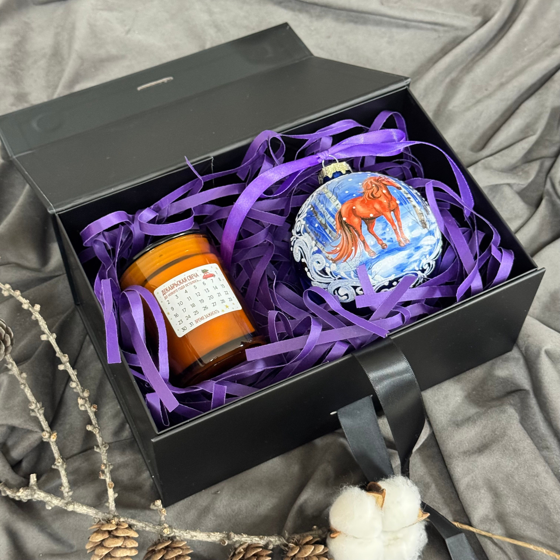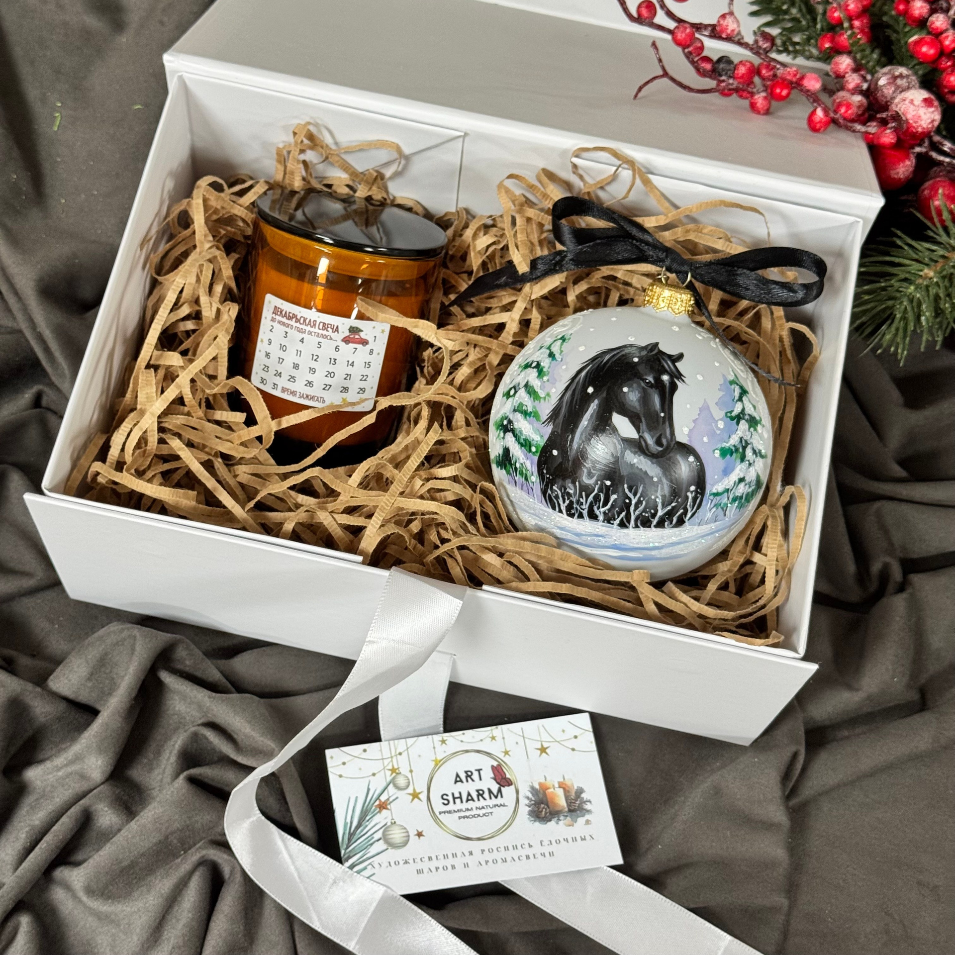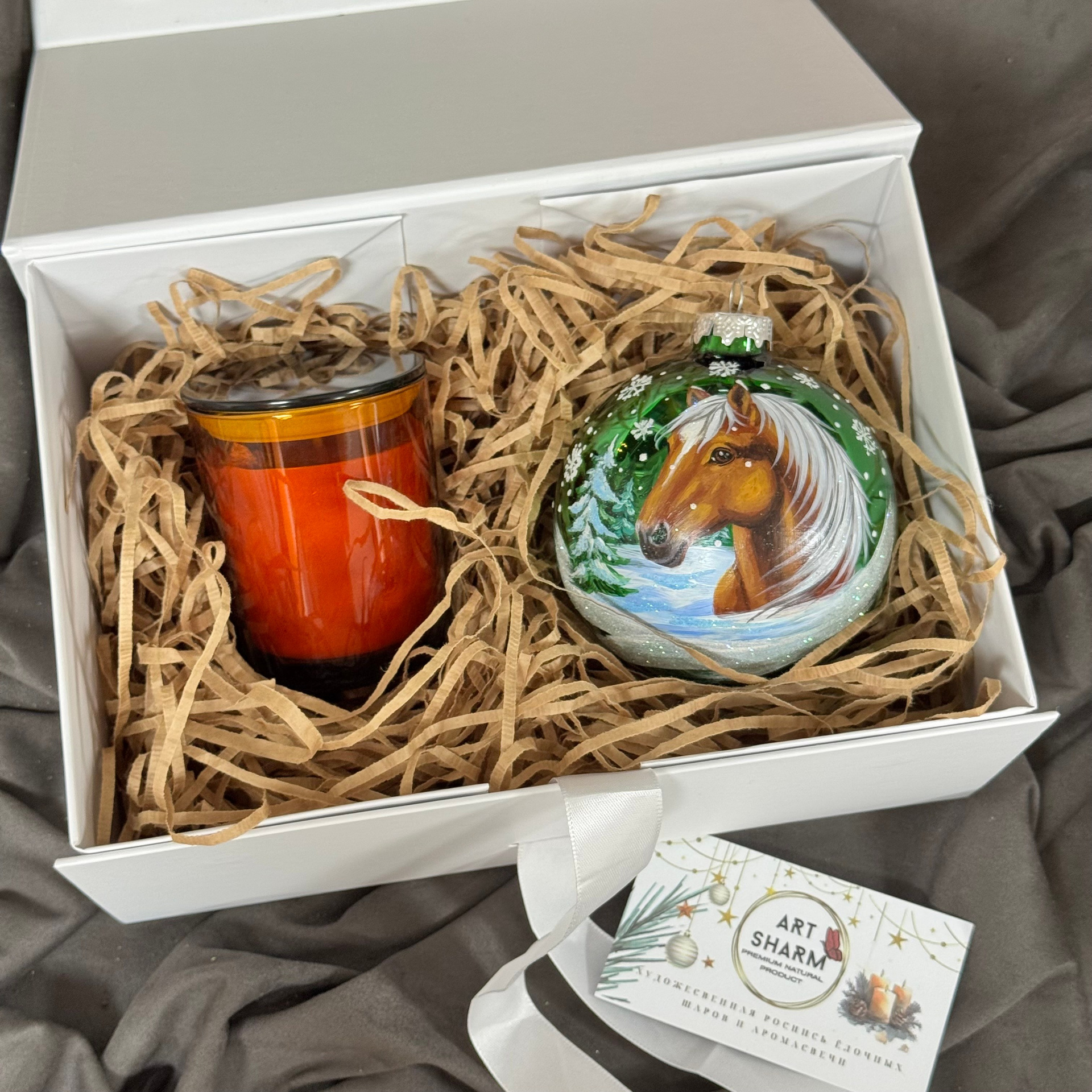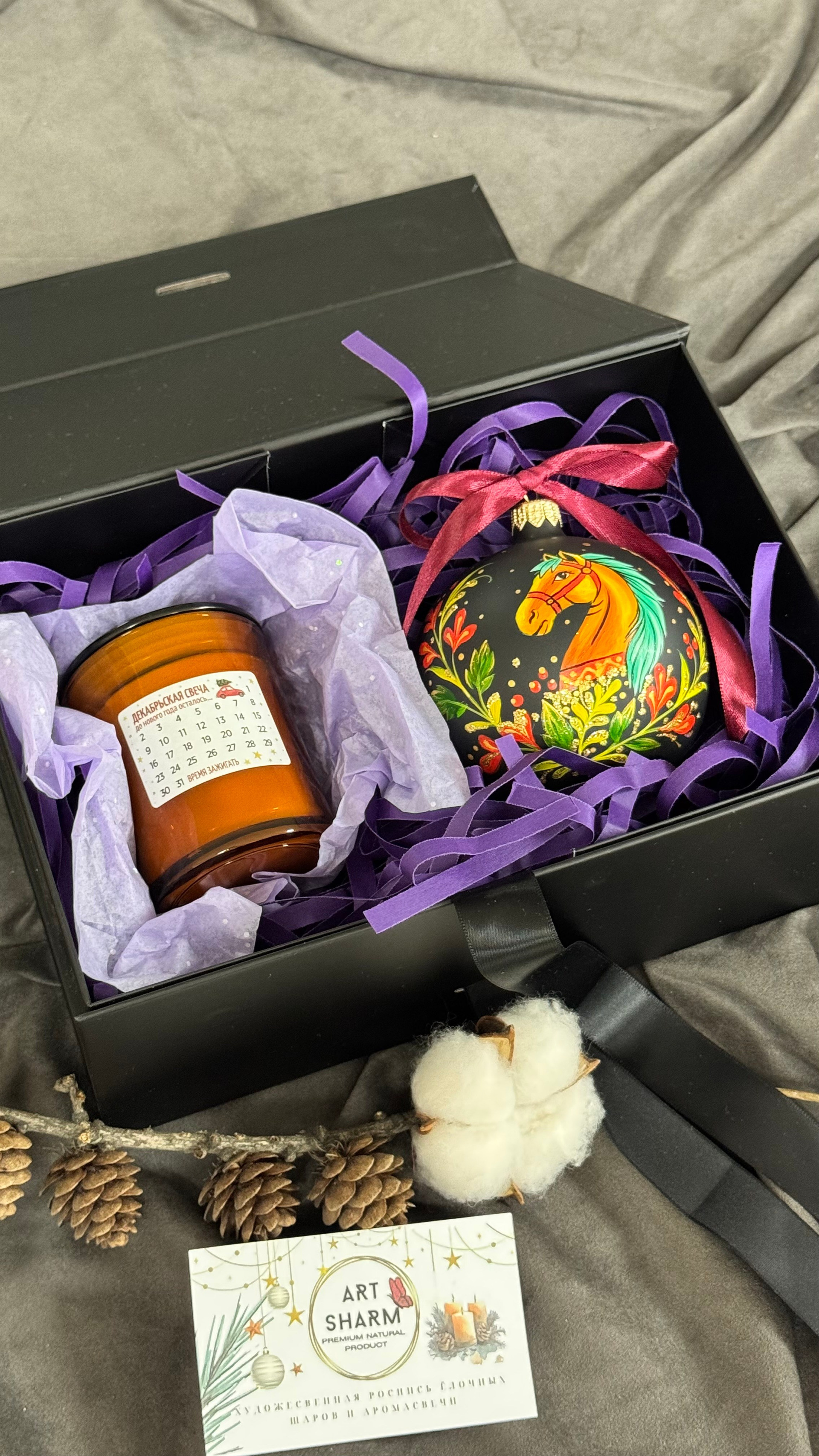 Состав набора: стеклянный шар с ручной художественной росписью 100 мм — «Конь в хвойном лесу», свеча авторская (аромат «Хвойный лес»), подарочная коробка с мягким наполнением и магнитныи клапаном с лентой.