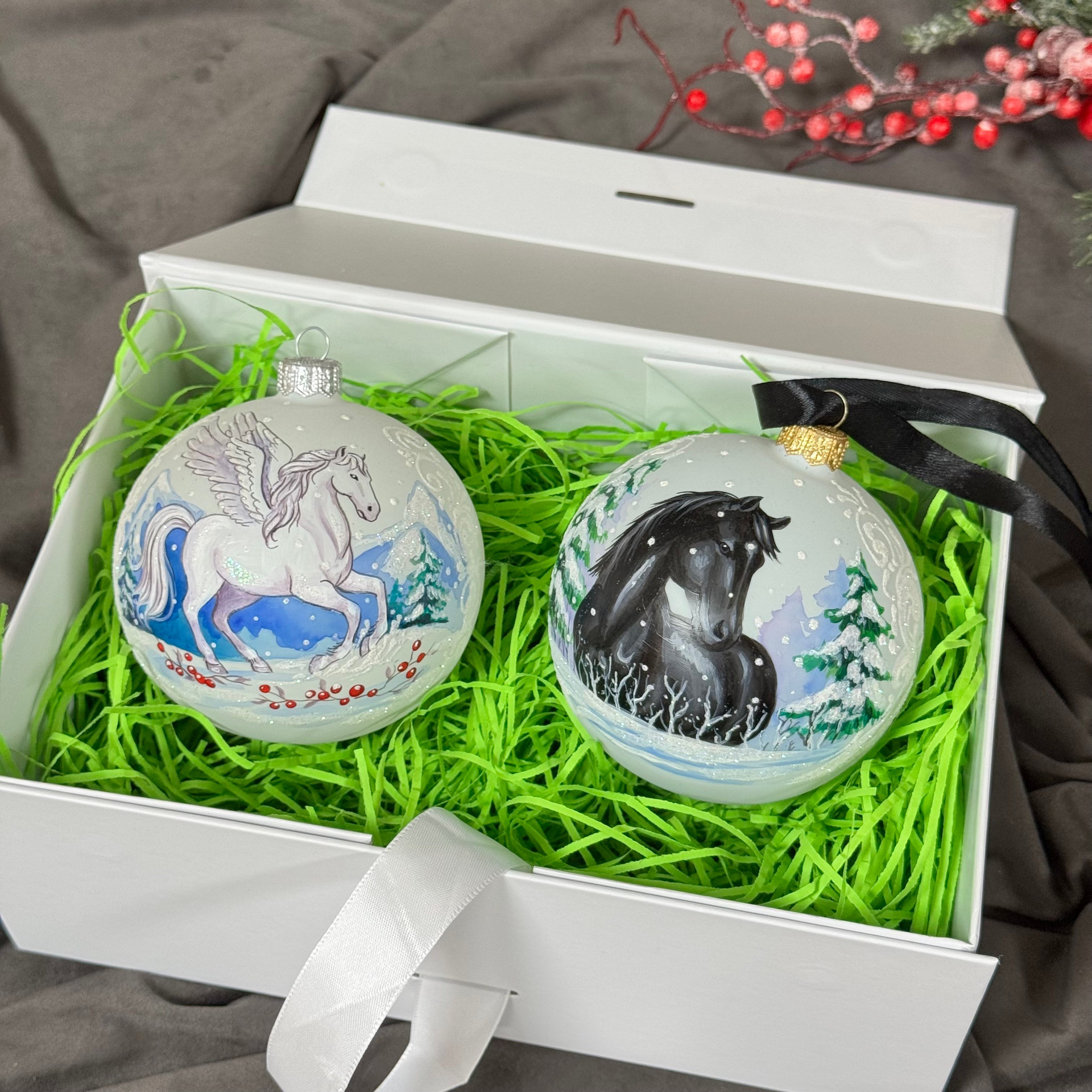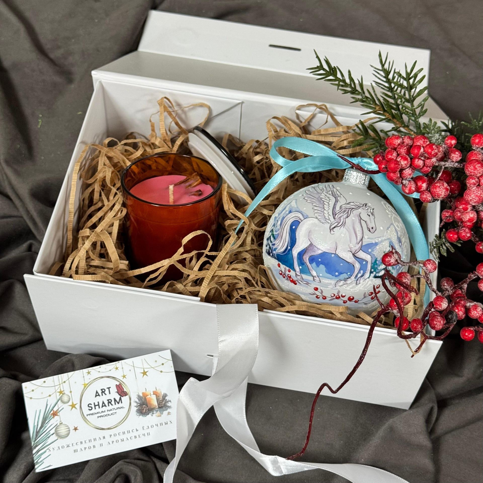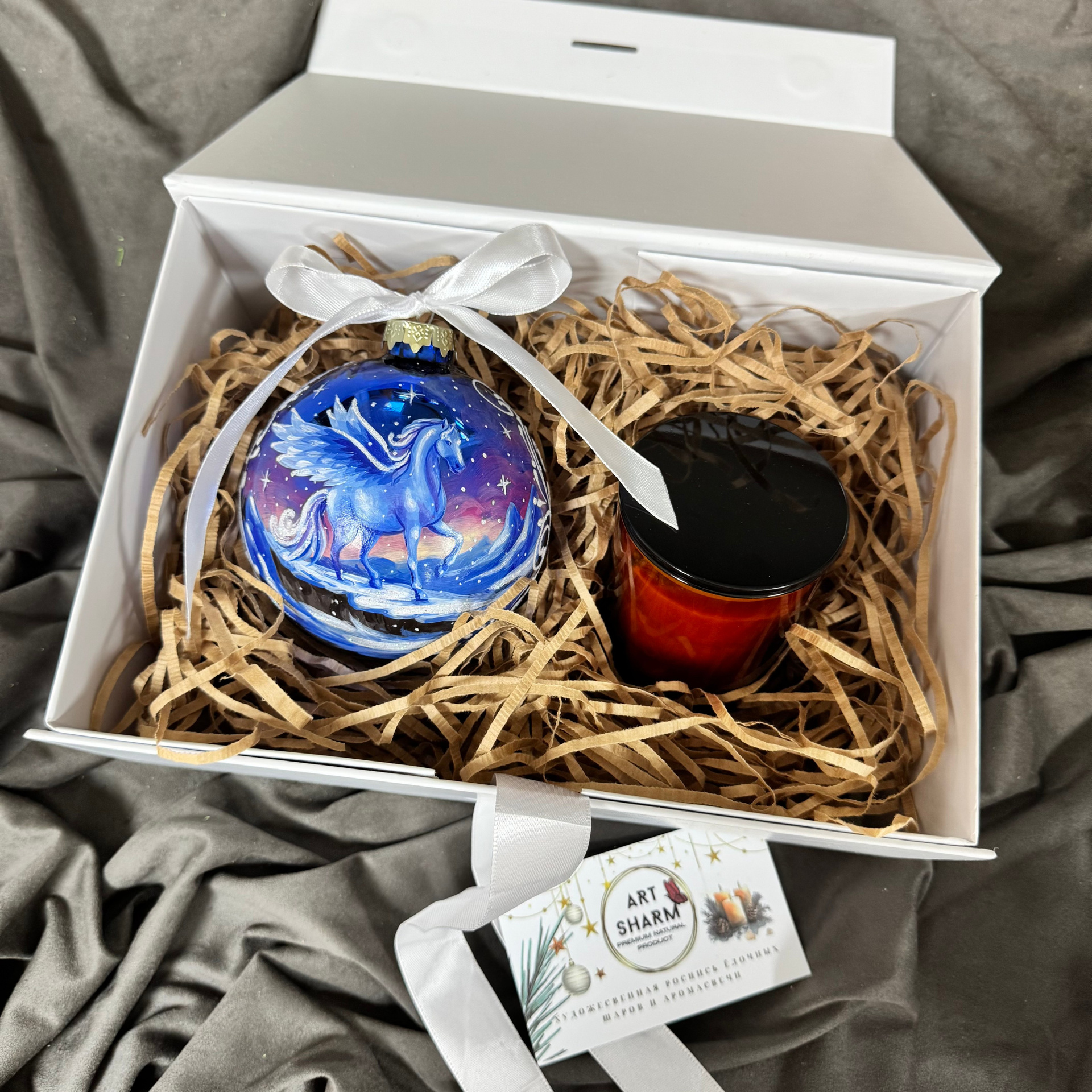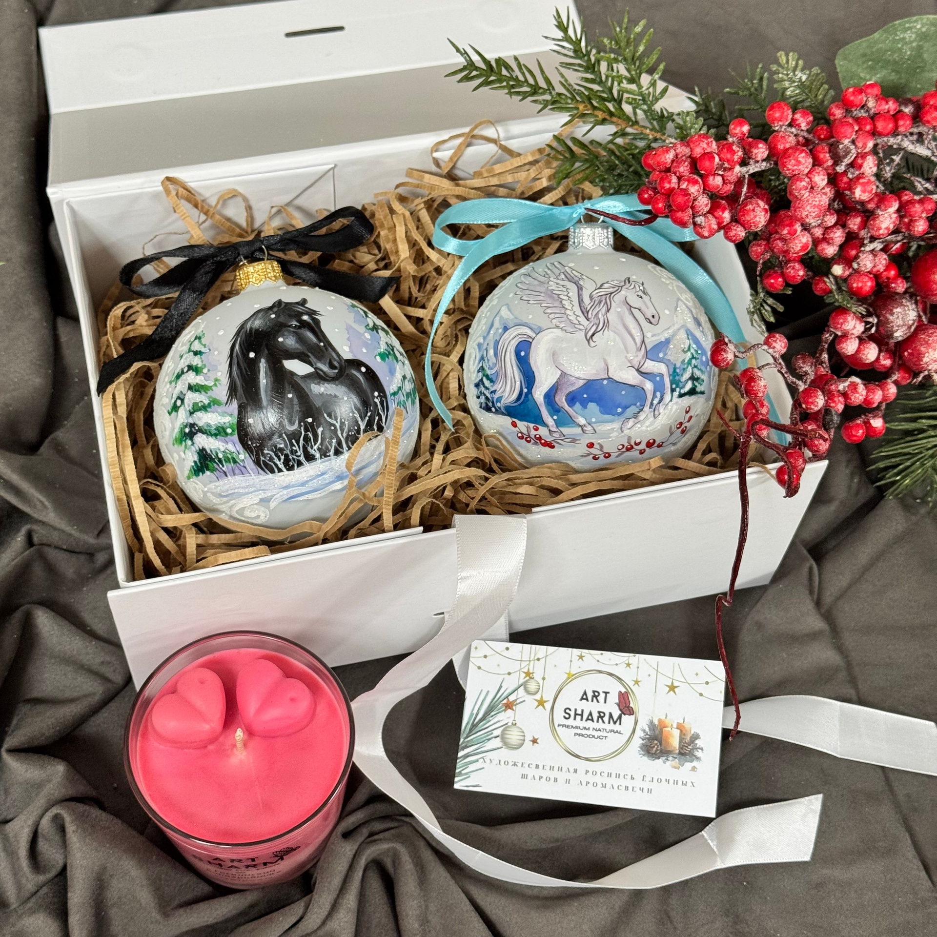 Состав набора: стеклянный шар с ручной художественной росписью 100 мм — «Конь в хвойном лесу», свеча авторская (аромат «Хвойный лес»), подарочная коробка с мягким наполнением и магнитныи клапаном с лентой.